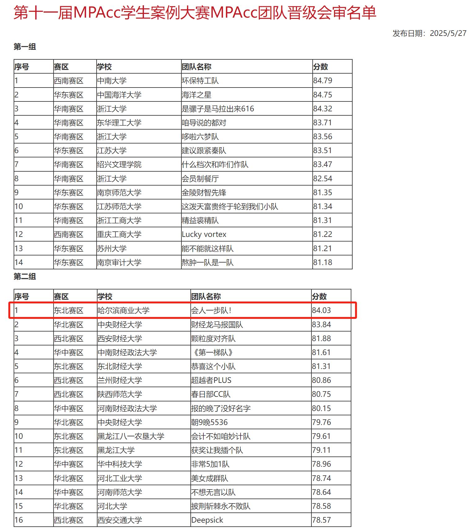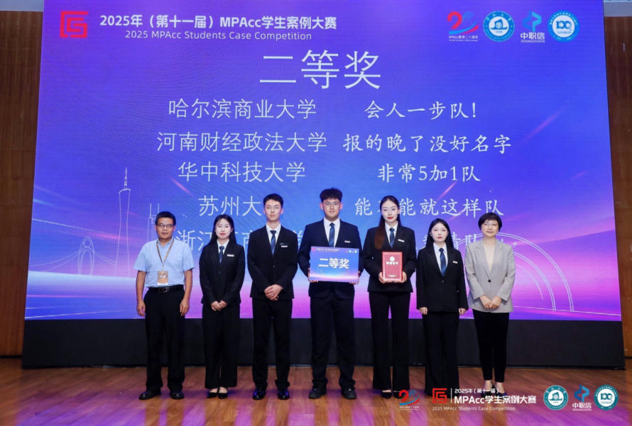 在2025年3月至6月举办的第十一届全国MPAcc学生案例大赛中,哈尔滨商业大学“会人一步队!”(成员:朱光泽、姜帆、尹澧、马琳琳、艾敬同)以黑马之姿首次跻身全国十强,最终斩获全国二等奖,刷新了黑龙江省高校在该赛事中的历史最佳战绩。