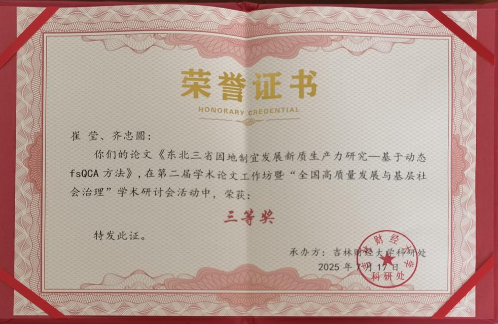 17日晚举行了闭幕式,闭幕式上会议公布了优秀论文评选结果,并为获奖团队进行颁奖。会计学院教师崔莹及其硕士研究生齐忠圆合作的学术论文《东北三省因地制宜发展新质生产力研究-基于动态fsQCA方法》在此次学术会议交流中荣获三等奖。